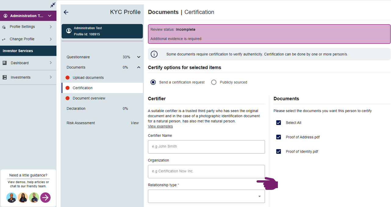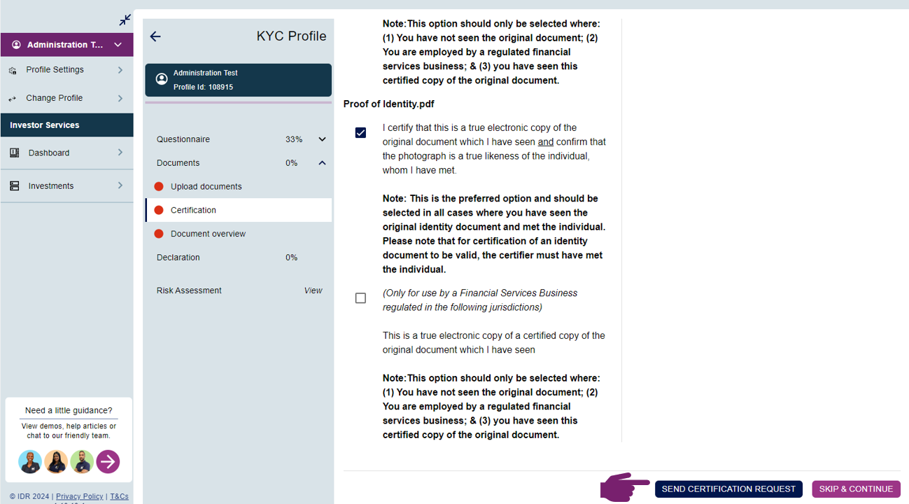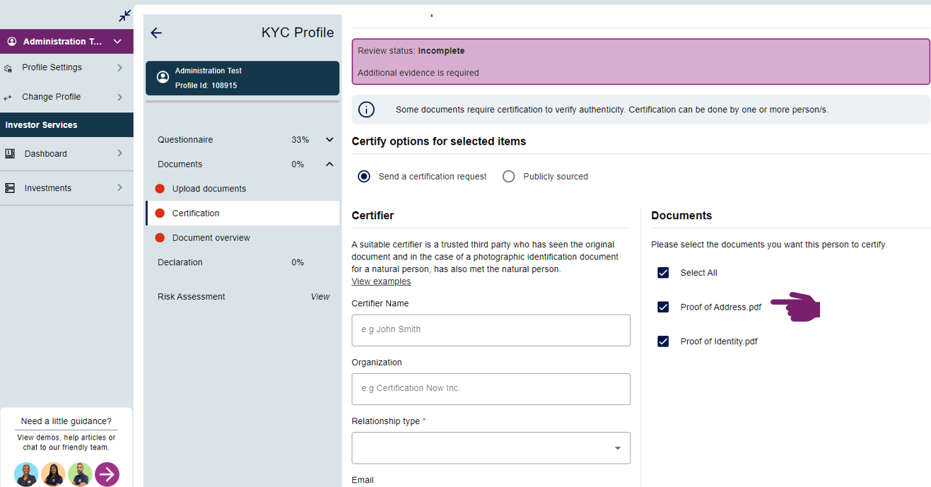 Select the Documents: Choose the documents you wish to send for certification on the right: